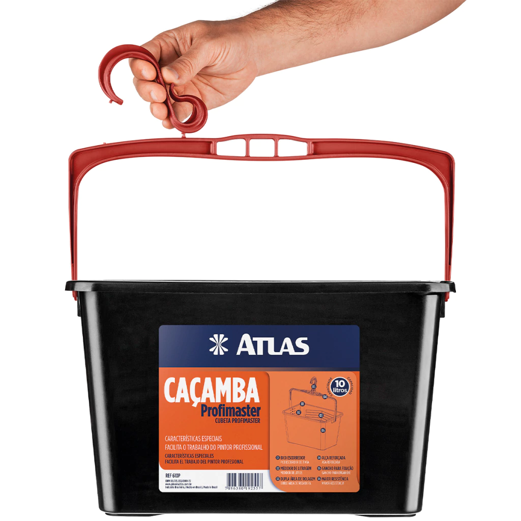 Caçamba para Pintura Atlas, o suporte completo para a sua pintura. Possui gancho para fixação, medidor de litragem, dupla área de rolagem e mais benefícios. Capacidade