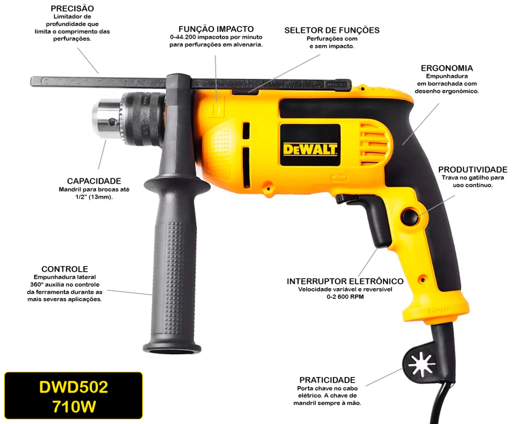 A furadeira de impacto da Dewalt 110V é a escolha perfeita para quem busca inovação e solidez. Com mais de 100 anos de experiência, a Dewalt é sinônimo de qualidade e desempenho excepcionais. Possuindo um design compacto, leve e ergonômico, essa furadeira não pode faltar no seu kit de ferramentas. Seu mandril de 13mm permite manipulação precisa e segura. Além disso, sua velocidade variável proporciona uma experiência personalizada, adaptada às suas necessidades. Versátil e eficiente, a furadeira elétrica pode ser utilizada em diversas aplicações em alvenaria, madeiras, metais ou plásticos. Sinônimo de tecnologia e excelência, essa furadeira é a escolha perfeita para profissionais em busca de durabilidade e alto desempenho. Descubra todo o potencial que essa ferramenta oferece.