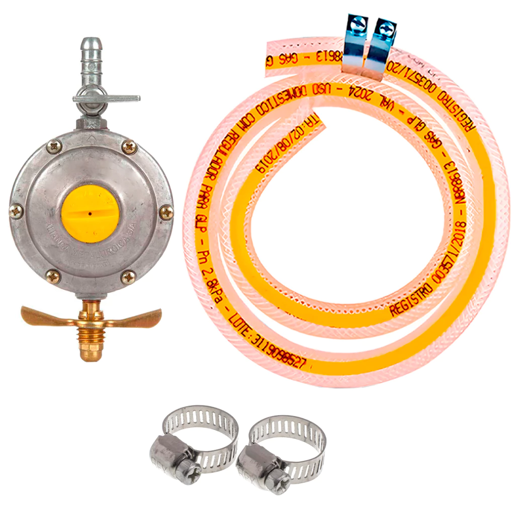 O regulador de pressão de 2 kg/h com registro borboleta proporciona controle preciso e fácil do fluxo de gás. A mangueira transparente com reforço interno é resistente, homologada, e possui 1,25 metros de comprimento. As duas abraçadeiras de inox garantem uma fixação segura e vedada nas conexões.